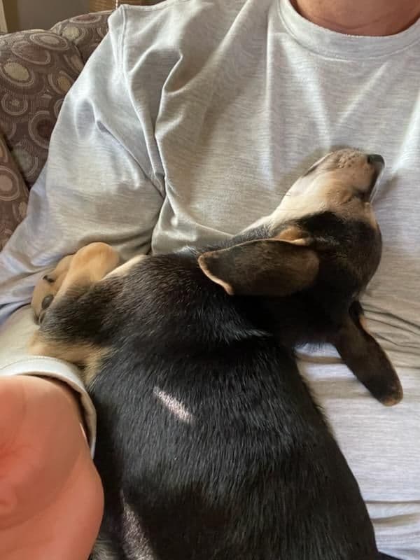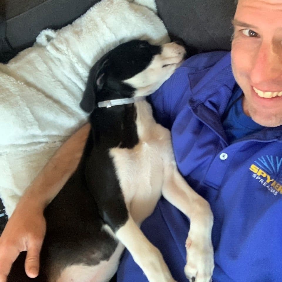 Vinny Van Gogh, or just Vinny for short, went home with Brandon, who’s an artist and was drawn to the dog’s unique name, as well as his cute personality. “ We lost our 18-year-old cat two months ago, and my wife and I, along with our 4-year-old rescue dog Belle, had been feeling like we were missing a fourth member of the family.” Vinny is a big snuggler who loves to watch TV and roll on his back for belly rubs. He also enjoys cleaning up sticks in the backyard and playing with his sister Belle Starr, the Pyrenees/black lab/cattle dog mix.