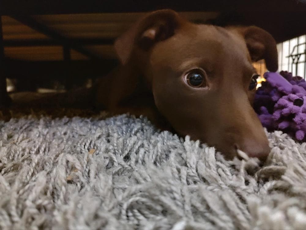 Ma’am is a four-month old chocolate lab mix that captured the heart of her owner since the second he laid eyes on her. “It was love at first sight!” Kelly says. Ma’am’s favorite things to do are crawl under the bed, play fetch, and go outside with her golden retriever friend who lives upstairs.