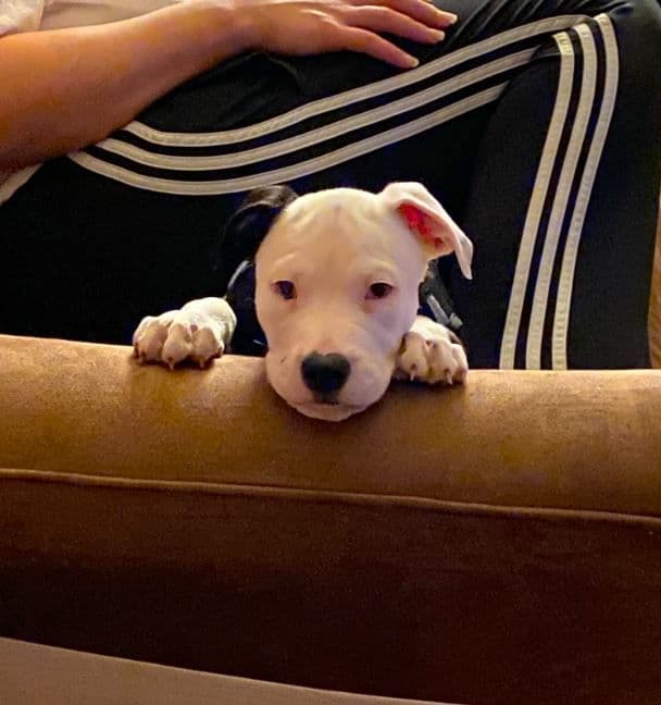 Ace, pictured above as a pup, is an American Bulldog mix with beautiful blue eyes. Before choosing Ace, Jacqui got to play with all of the puppies in his litter, as well as his mom. She chose Ace because he was so gentle.